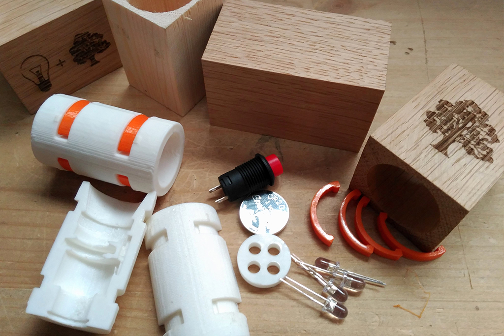 L’objectif est de pouvoir assembler soi-même sa lampe et ainsi mieux appréhender chacune des parties. La partie centrale est réalisée avec une imprimante 3D, et l’extérieur est composé de bois massif.